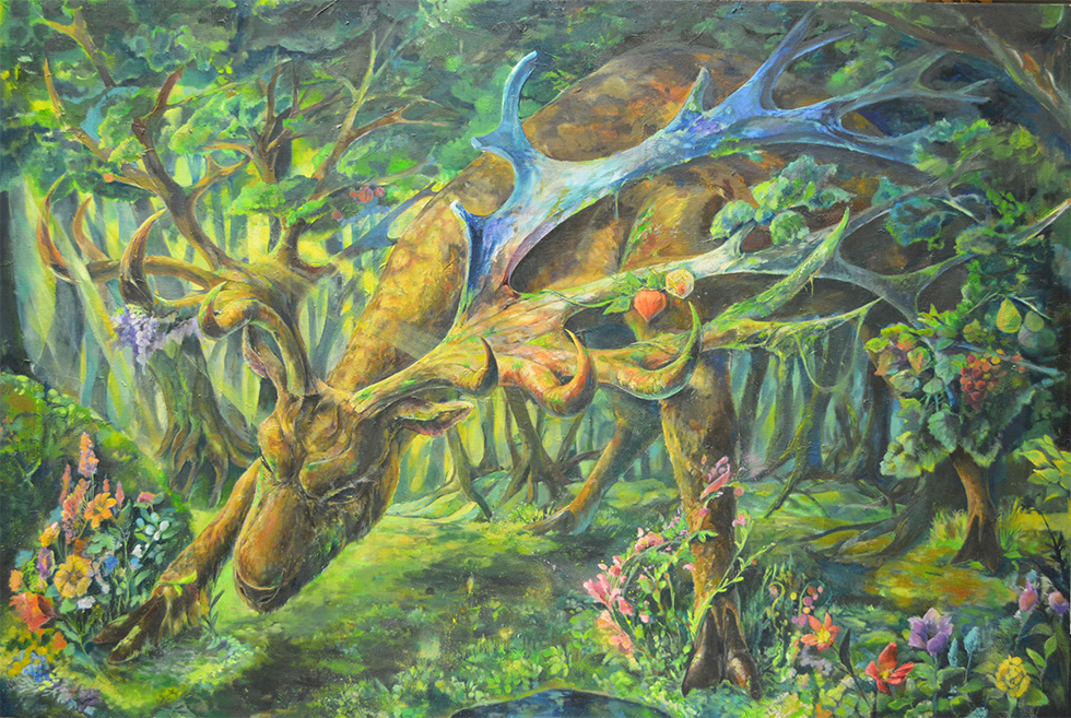 「生命」は鹿に植物や森を合わせることで、鹿の溢れるような生命力を表現しています。