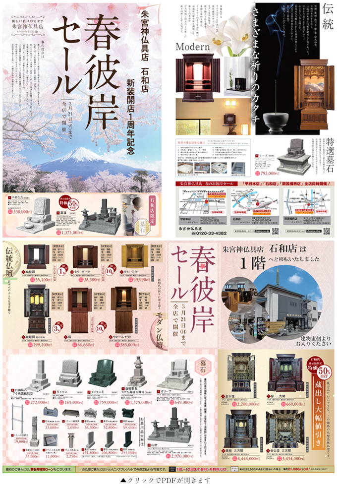 朱宮神仏具店では「石和店」新装開店1周年記念として春彼岸セールを開催いたします。