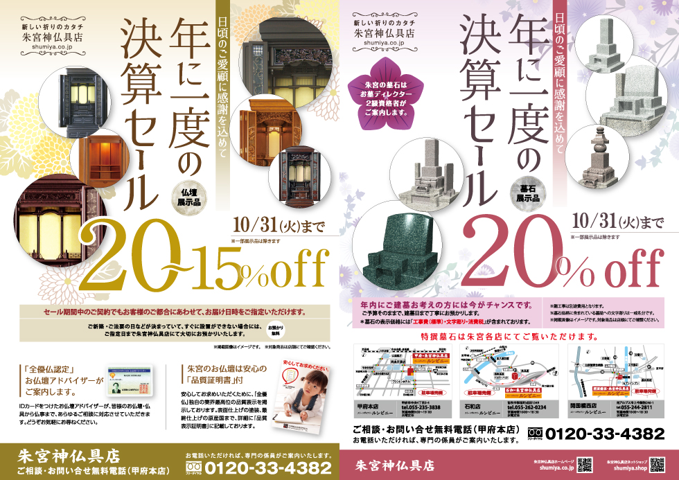 墓石展示品は20%OFF、仏壇展示品は20~15%OFFとなります。