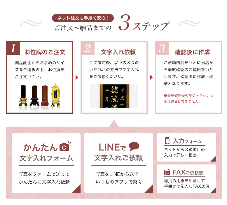 ご自宅にいながらお位牌のご注文から受け取りまで可能なので、ご来店いただく必要がありません。細かな相談や文字入れ依頼もメール・LINE・FAXなどからご依頼可能です。
